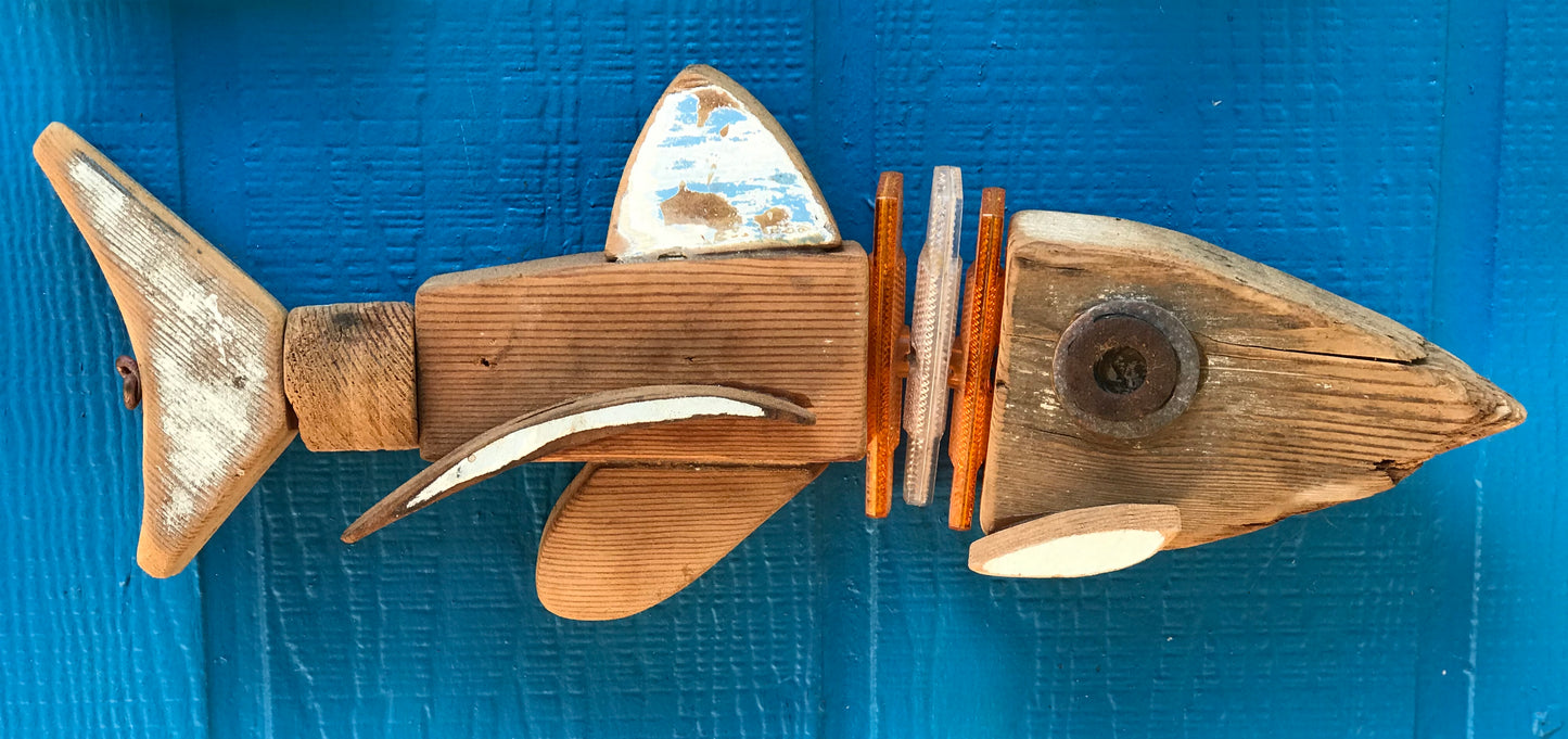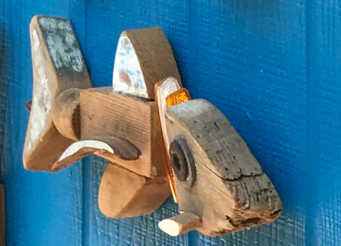 Up-cycled 2 x Doug Fir and bicycle reflectors tied nose to tail with #8 (heavy-duty) copper wire.