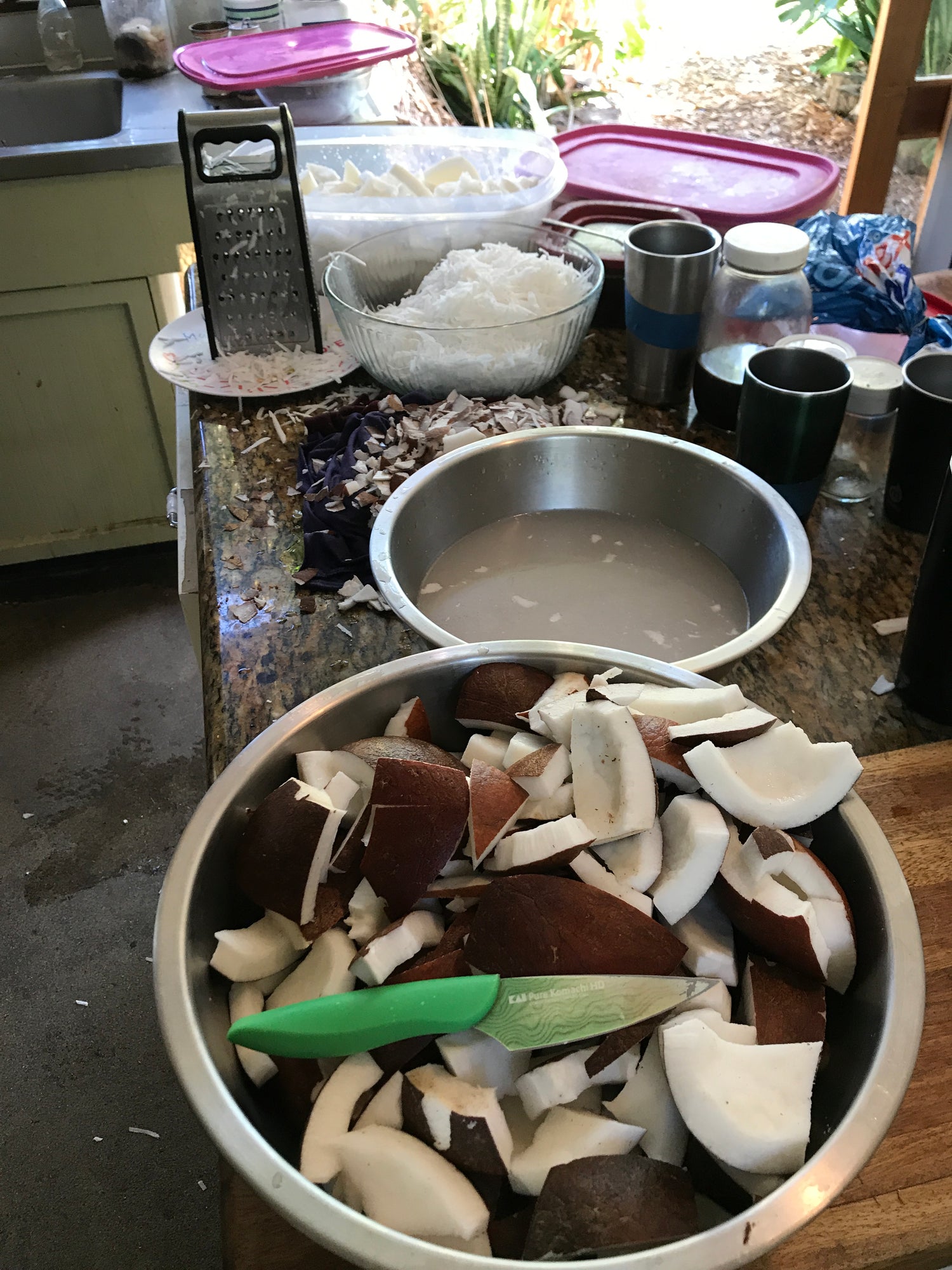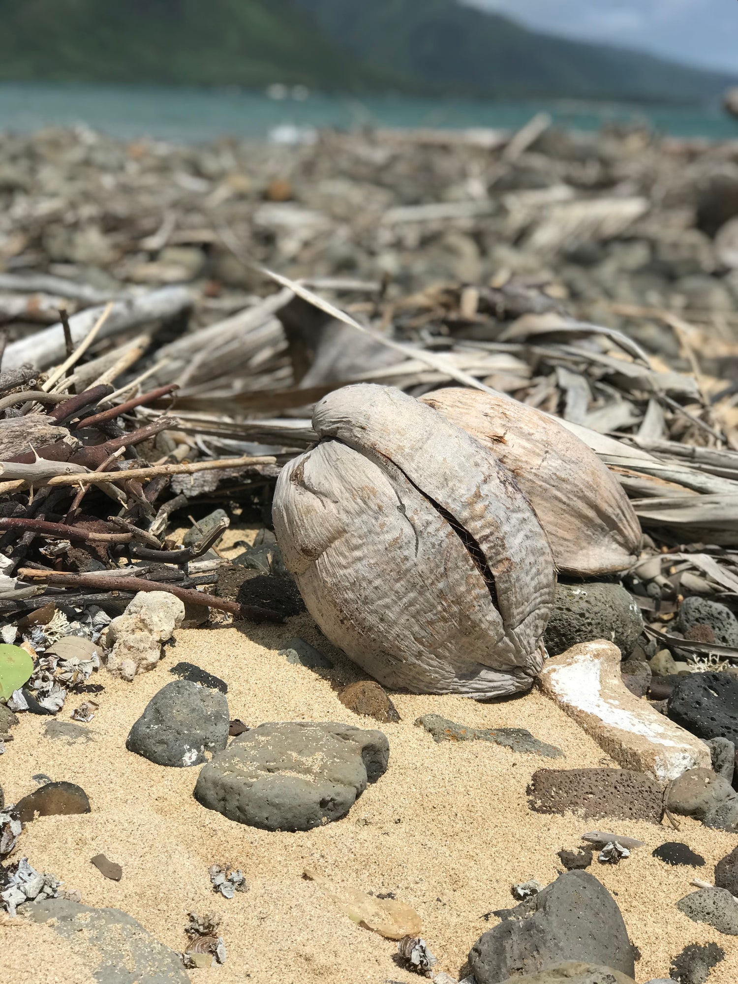 ビーチでココナッツを見つけると、ココナッツの肉は通常腐っ ています。この副産物をマルチに使用して、土壌を活性化させ ます。カイルアビーチに住む友人からいただく乾いたココナッ ツは、その果肉が通常新鮮なので、食事に使用するためにココ ナッツを細断して乾燥させます!