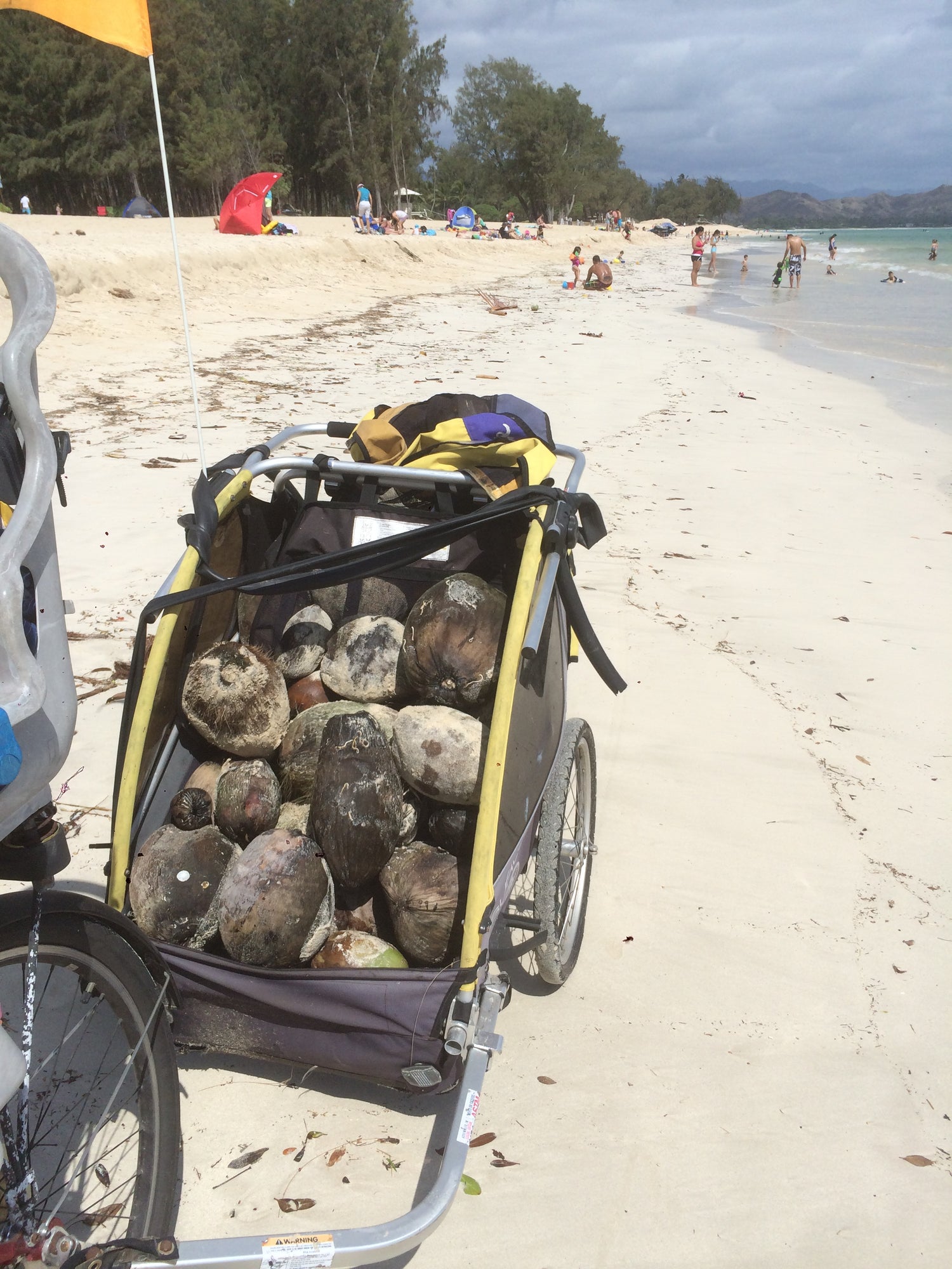 私たちは自身の体を動力に、ベビーカー、自転車トレーラー、 重いバッグを使って、ビーチからココナッツをすべて自分たち の手で家まで運びます。時には海岸が遠方の場合、プナルウま で行く場合などは、トヨタ プリウス ハイブリッド車の後部座 席に積み込みます。